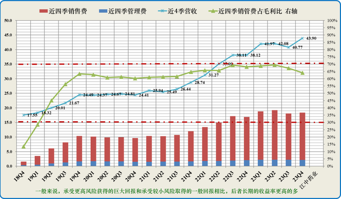 该指标用于分析公司商业模式内产生净利润能力的强弱。可关注近四季销售和管理费用与毛利润之比持续小于30%的公司,这样的公司具备较高的竞争优势(即图中绿线折线低于下红虚线为优异,靠近为优秀);若该指标处于30-70%之间图中红色虚直线之间为可接受区域;若大于70%需要警惕,说明该公司产生净利润的能力较弱。