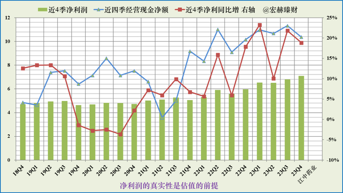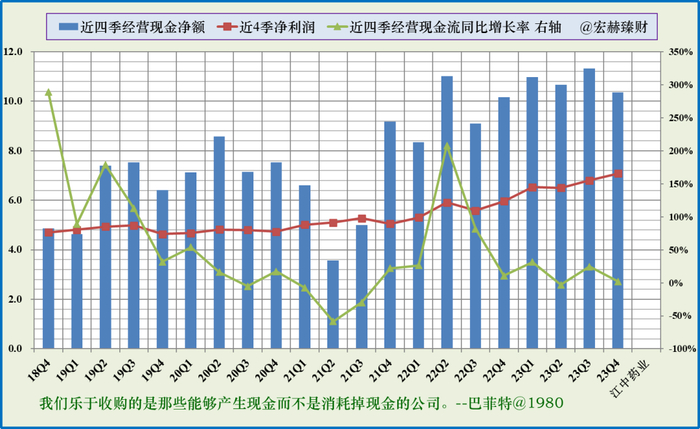 蓝色折线持续在绿色柱图上边及以上,显示净利润含金量高。