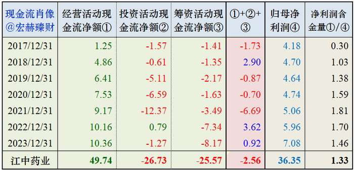 首先要关注经营活动现金流净额①要持续为正且≥归母净利润④为优(即最后一列≥1为优);其次要关注①②③项的变动趋势,从而体会公司的经营周期。