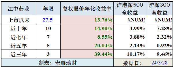 公司上市以来,近十年、近七年、近五年的复权股价年化收益率与同期有效参照规模指数对照如下表: