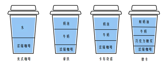 图片来源:喵小妹自制。美式=意式浓缩+水。拿铁的牛奶比例是浓缩咖啡的两倍。摩卡也属于拿铁咖啡,只是额外添加了一层巧克力糖浆。卡布奇诺的浓缩咖啡、牛奶和奶泡三种成分比例完全相等。