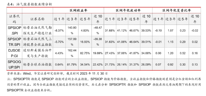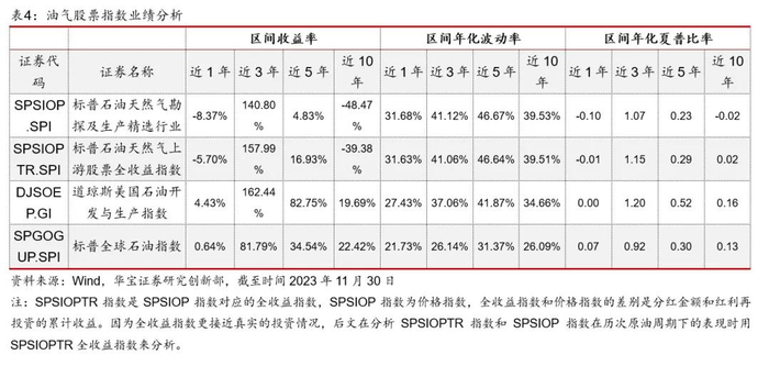 从反映油价涨跌或拟合程度来看,标普石油天然气上游股票指数全收益指数(SPSIOPTR指数)>道琼斯美国石油开发与生产指数(DJSOEP.GI)>标普全球石油指数指数(SPGOGUP.SPI)。