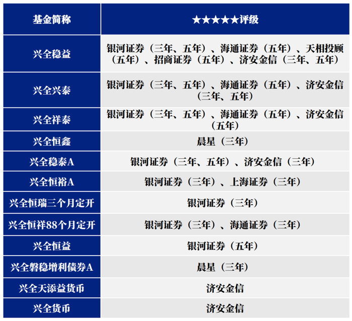 兴证全球基金固收业务的愿景是为每一位持有人做到“求稳每一步,投资小幸福”。目前已形成丰富的固收产品线,涵盖货币、纯债、一级债、二级债、偏债混合、定开债基等,风险收益特征鲜明,服务于不同风险偏好的投资者。截至2023年底,济安金信给予公司纯债型基金、货币型基金★★★★★评级。固收团队旗下多只产品荣获证监会认可的基金评价机构★★★★★评级。