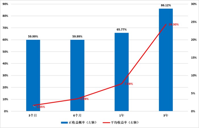 以滚动持有中证基金指数为例,持有3个月到6个月的收益特性都较为一般,可只要时间延长到1年及以上,正收益概率和平均收益率就会上升,其中三年平均收益率达到了24.30%,市场之中阵风频频,但绝不言弃会有所收获。(来源:Wind,统计区间:2013/01/01-2023/12/31)