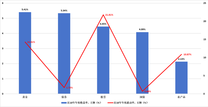 来源:Wind,统计区间:2014/01/01-2023/12/31;注:上图示例中股票为中证全指(000985.CSI),债券为中证全债(H11001.CSI),国债为国债指数(000012.SH),黄金为国际金价(GC.CMX),农产品为南华农产品(NH0300.NHF),房地产为新建商品房价格指数