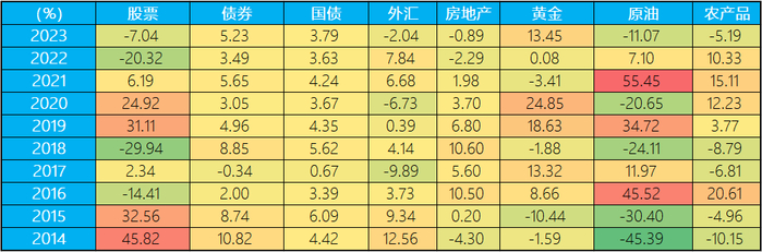 来源:Wind,统计区间:2014/01/01-2023/12/31;注:上图示例中股票为中证全指(000985.CSI),债券为中证全债(H11001.CSI),国债为国债指数(000012.SH),外汇为美元指数(USDX.FX),黄金为国际金价(GC.CMX),原油为纽约轻质原油(QM.NYM),农产品为南华农产品(NH0300.NHF),房地产为新建商品房价格指数
