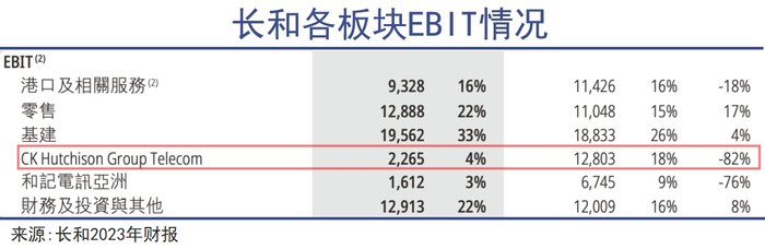 2019年,CKHT的息税前利润还有211. 31亿港元,而到了2023年仅剩22.65亿港元。也就是说,这家子公司的价值创造能力几乎是4年前的十分之一,这正是长和目前所遭遇的一个相当重大的问题。