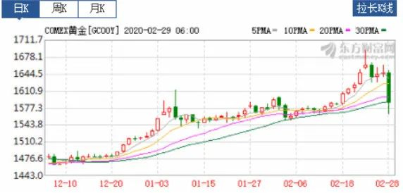在2020年2月底(疫情刚开始),全球股市风险资产出现大幅下跌之时,在2月28号这一天,黄金作为传统避险资产竟然也同步遭到抛售。COMEX 4月黄金期货暴跌75.80美元,跌幅4.61%,创7年来最大跌幅。