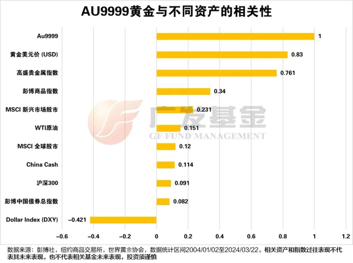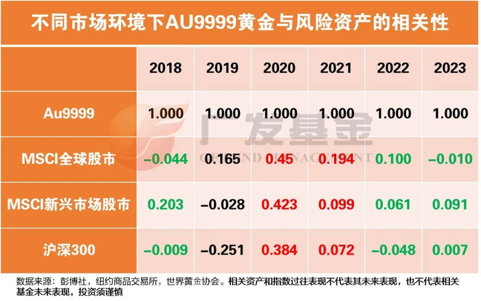 黄金能为投资组合提供风险分散的作用,尤其是与主流资产的相关度较低,在投资组合中加入黄金,能够较好的分散投资风险。世界黄金协会表示,黄金通常在高风险偏好时期与股市正相关,而在低风险偏好时期与股市相关性大幅降低,并转变为负。这种属性在市场上大多数的避险资产中独一无二