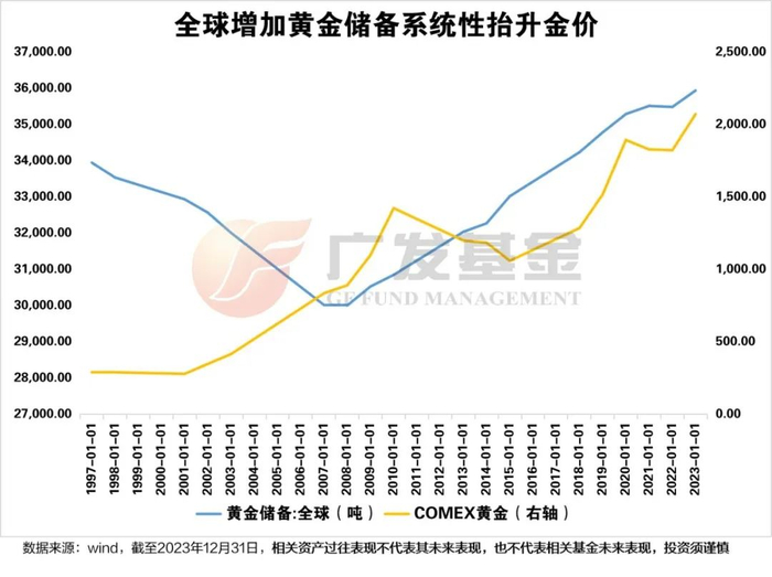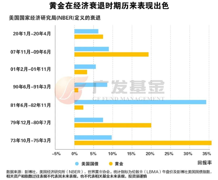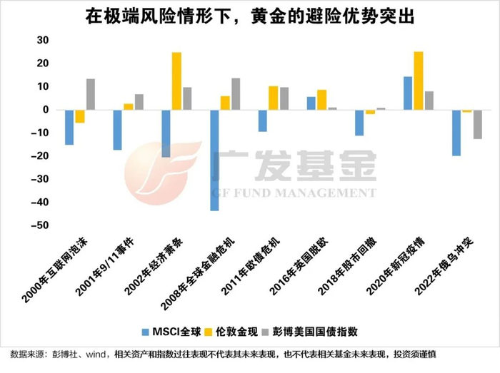 黄金具有避险属性,可作为整体宏观经济环境风险的对冲,尤其在极端风险情形下,黄金对冲全球股市以及美债的优势会更加突出。比如2000年的互联网泡沫破裂、2008年全球金融危机、2011年欧债危机、2016年英国脱欧、2020年新冠疫情和2022年俄乌冲突,黄金价格相对于全球股市和美债收益都有较好的表现。在过去七次经济衰退中,有五次黄金表现良好,帮助投资者减少了投资组合的整体损失
