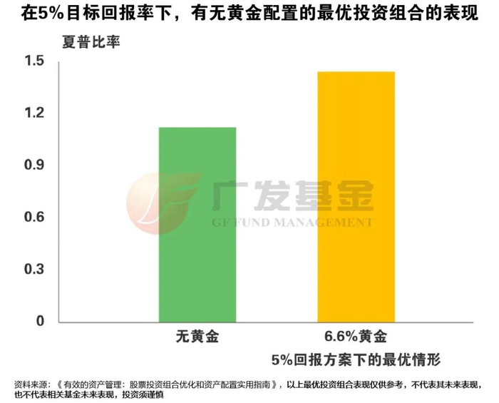 与其他大类资产比,黄金的波动性较低。在既定目标投资收益的情况下,投资组合通过增加黄金,可以实现降低组合的波动率,提高投资组合的风险回报率