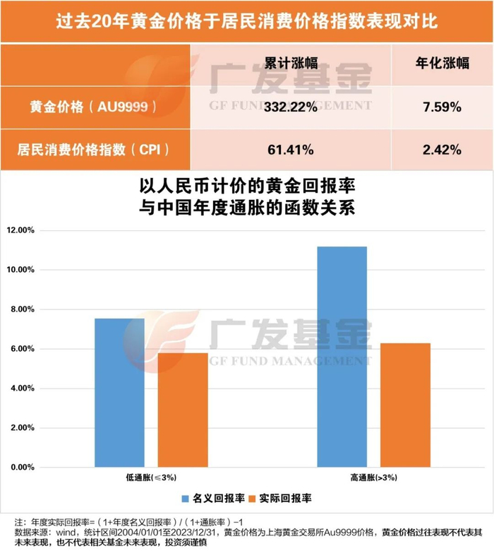 长期以来,黄金是一种对冲通胀的工具。对比过去20年黄金价格和居民消费价格指数(CPI)的表现,可以明显地看到,黄金价格(AU9999)累计涨幅332.22%,年化回报为7.59%,远高于同期居民消费价格指数的表现。在通货膨胀率高于3%的年份中,黄金价格平均上涨了11%。由此可见,黄金可作为不错的抗通胀型资产