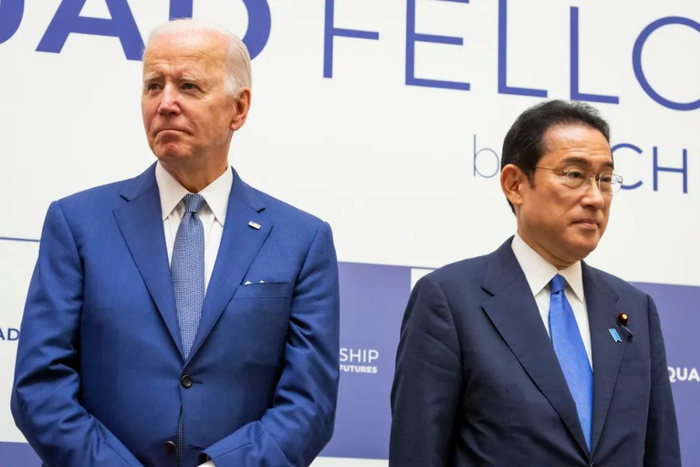 ▲2022年5月24日,在日本东京,美国总统拜登(左)与日本首相岸田文雄出席美日印澳“四边机制”峰会后的活动。(新华社发)