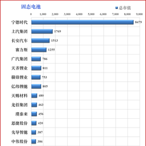 市值三甲:宁德时代 8479亿、上汽集团1769亿、长安汽车1513亿。