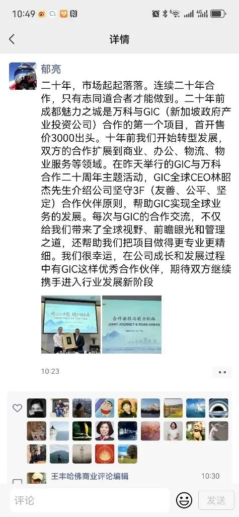 4月13日,万科董事会主席郁亮发朋友圈展示在成都举行的GIC(新加坡政府投资公司)与万科合作二十周年主题活动,并附上他与GIC全球CEO林昭杰的合影。“连续二十年合作,只有志同道合者才能做到。”郁亮在朋友圈称。