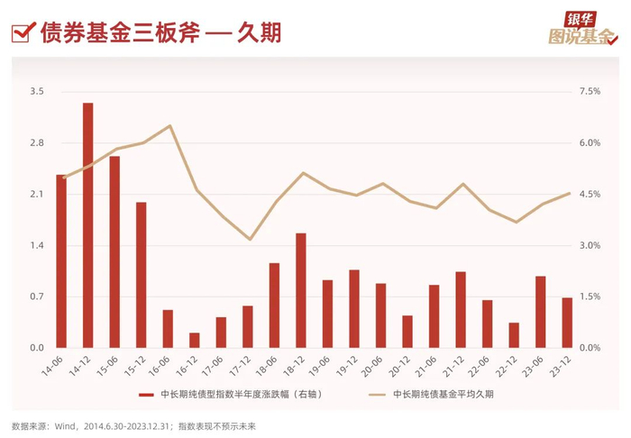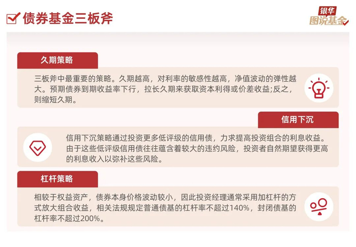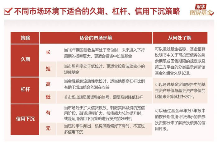 15、对应到债券基金三板斧,不同的市场环境下,针对久期策略、杠杆策略以及信用下沉策略的具体运用会有不同的匹配方式。投资者可以通过定期报告、招募说明书等途径了解产品的相关策略并结合当下市场环境进行选择。
