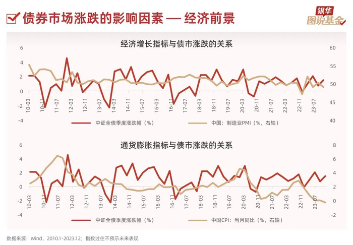 6、债券收益率受到经济基本面的影响,主要包括衡量经济增长的指标(GDP/PMI)和衡量通货膨胀水平的指标(CPI/PPI)。两方面经济前景指标一定程度上和债市表现呈负相关关系。