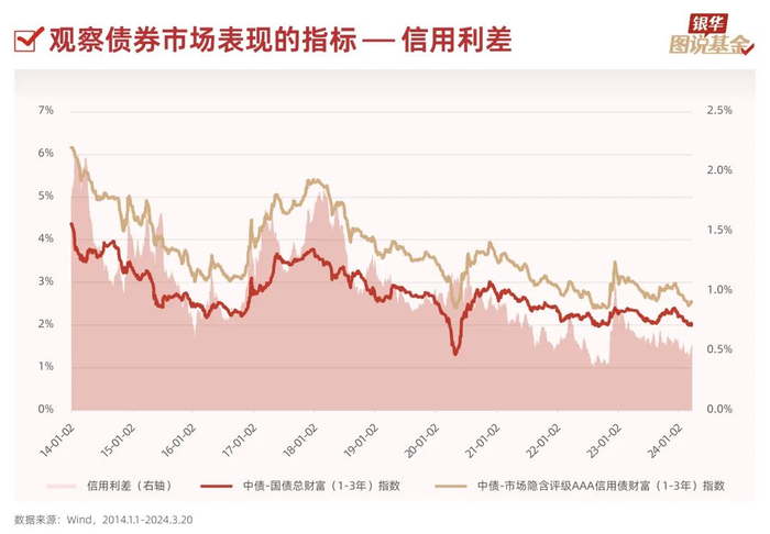 4、信用利差可以理解为借钱给企业的风险补偿,计算的是相同期限信用债收益率相较无风险利率的差额,这一差值可以看作对投资者投资信用债所承担的风险补偿。一般来说,信用利差越大,信用债的风险也会越大。