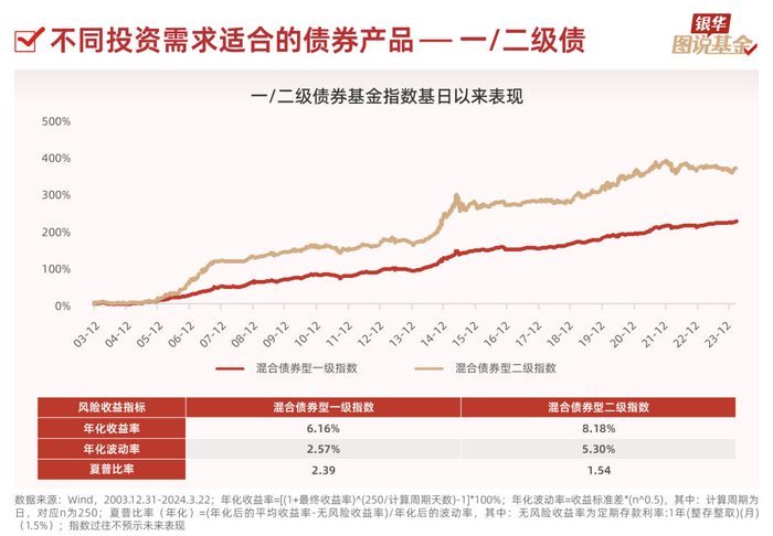 17、对于注重稳健配置需求、希望所选的基金波动相对可控,但同时想要有机会获得相对高一些的收益、自身又具备一定的风险承受能力的投资者来说,可以选择一/二级债基。一/二级债基在以债券打底的基础上,适当配置可转债/股票类资产,追求增厚收益。