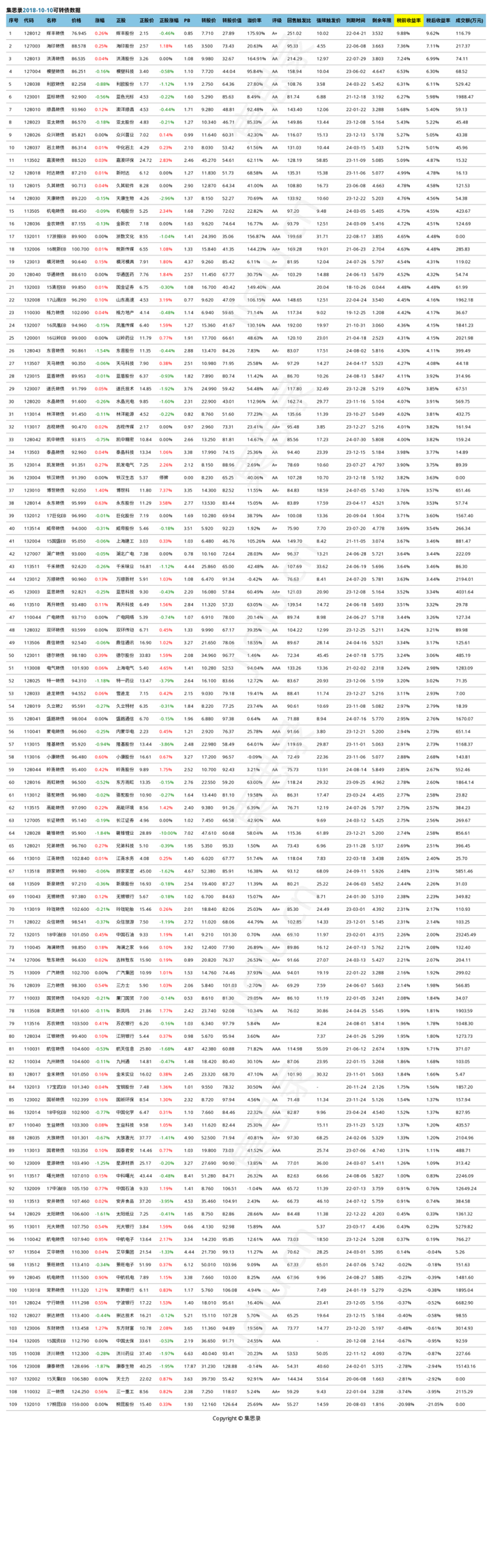 这是2018年10月10日,集思录可转债数据的历史快照: