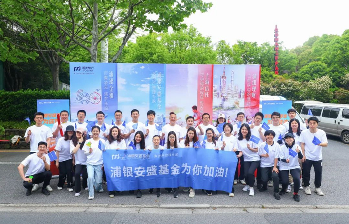 其中,来自浦银安盛基金的30余名志愿者在位于世博公园的“8公里加油站”集合,为参赛选手加油打气、补水助力。