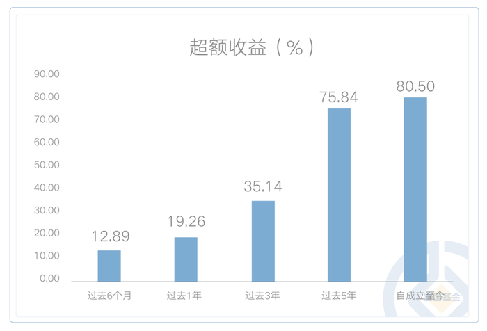 再看看它的长期业绩表现,也是一步一个阶梯,节节拔高,以相对业绩比较基准的超额收益数据为例,近6个月超额收益12.89%,近1年、近3年、近5年,超额收益率都犹如垒土,逐步走高。
