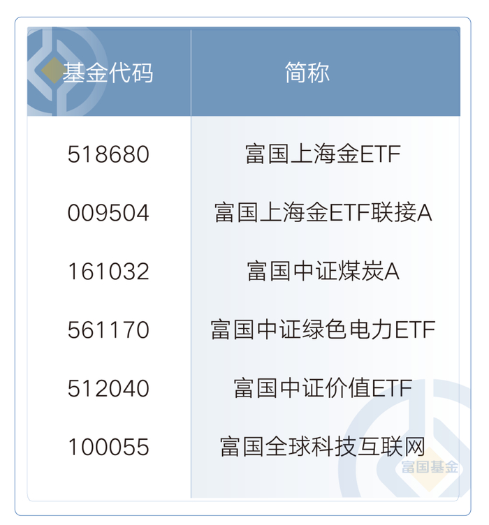 排在首位的是金ETF(基金代码:518680),紧跟其后的是它的联接基金——富国上海金联接基金(A类:009504;C类:009505),第三位则是中证煤炭A(基金代码:161032);此外,业绩排名靠前还包括了绿电50ETF(基金代码:561170)、富国全球科技互联网(基金代码:100055)、富国中证价值ETF(基金代码:512040),以及富国基金旗下偏债混合型——固收系列产品,如富国信享回报12个月持有A(基金代码:013678)、富国诚益回报12个月持有A(基金代码:012576)、富国稳进回报12个月持有A(基金代码:010029)。
