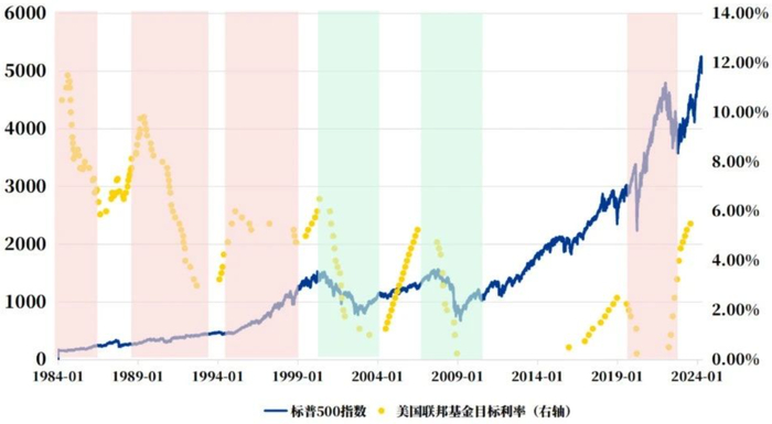 美国六次降息周期及标普500走势图