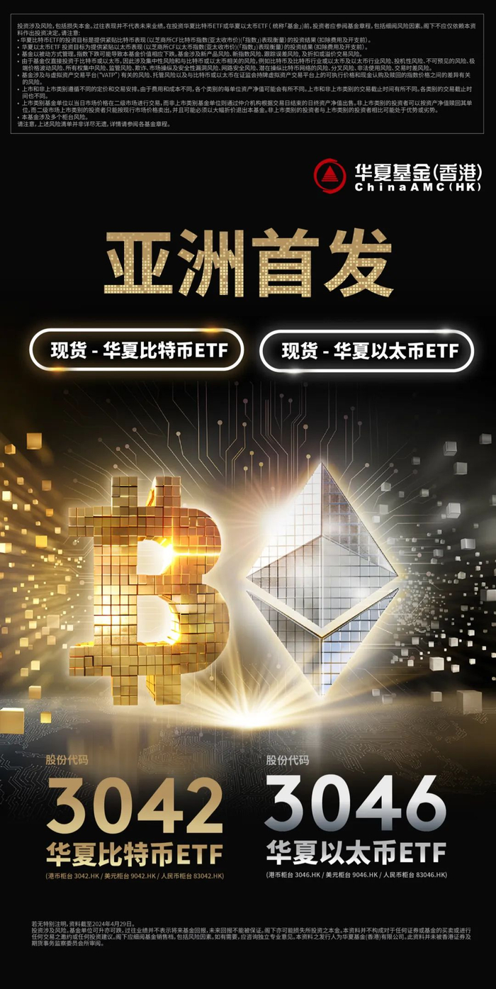 【香港,2024年4月29日】华夏基金(香港)今日宣布,推出华夏比特币ETF和华夏以太币ETF,并在2024年4月30日于香港联交所上市。