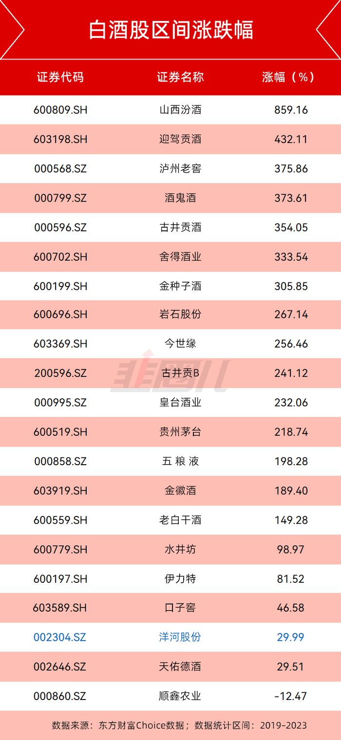 从2019年至2023年底,5年一个合理的周期内,洋河股价的涨幅是30%,在A股上市白酒企业里排第三,倒数第三。