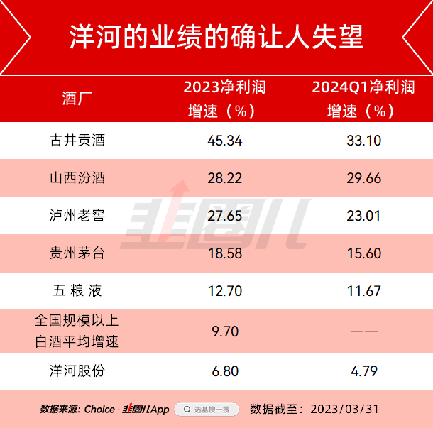 洋河2023年度包括2024Q1的业绩,和业内的头部酒企相比是非常糟糕的,连行业平均都比不上。