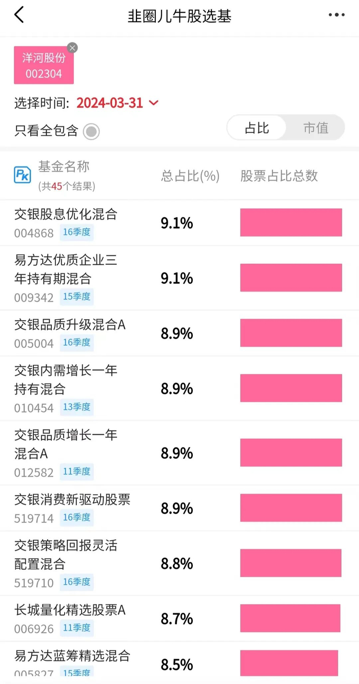 之前我下意识觉得,洋河应该是“易方达酒庄”和各种消费行业主题基金的重仓股,但昨天我用韭圈儿APP牛股选基了一下,才发现包括萧楠的消费基金在内,易方达权益团队几乎已经全部卖出了手中的洋河持仓。
