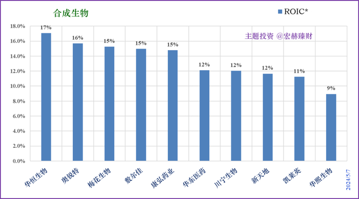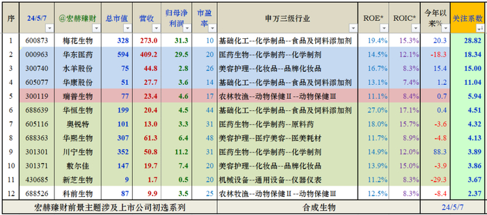 宏赫臻财根据行业具体特性,在64家“合成生物”概念涉及上市企业中,先筛选未来三年一致预期ROE值大于10%的企业;再筛选出ROIC大于7%的企业;最后剩余【12】家。