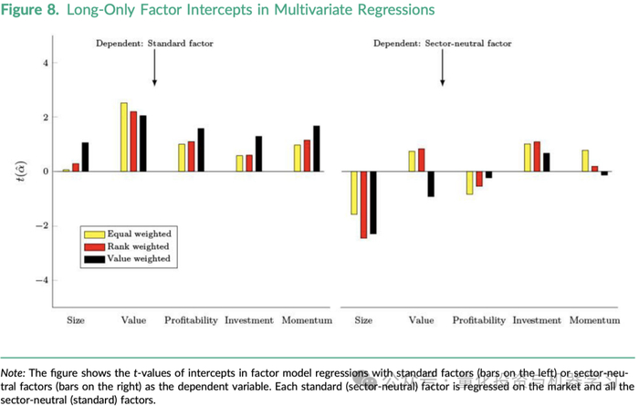 在图7中,当使用多空策略进行多元回归时,我们可以看到大多数标准因子(即未进行行业中性化的因子)的截距为负,而行业中性化的因子的截距大多为正,并且价值和盈利能力因子的截距统计显著。这一结果表明,在多因子投资组合中,行业中性化的多空策略能够提供额外的价值,即它们在考虑了其他因子后仍然能够带来正的超额回报。