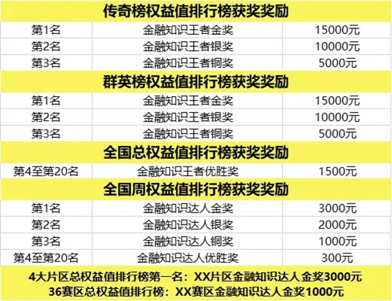 除了领红包,排名靠前的用户还有机会领取现金大奖:大赛为传奇榜、群英榜、全国周权益值排行榜前三名,以及全国总权益值排行第四至二十名等的用户均设置了大奖项,最高可得15000元!