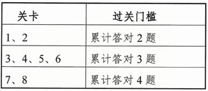 (3)当用户答对的题目数之过关门槛则闯关成功,获得相应权益值并计入权益值排行榜。如用户挑战关卡失败,则该关权益值清零,失败关卡支持重复挑战。过关门槛具体如下: