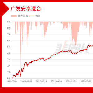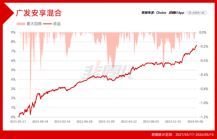 广发安享混合,近三年最大回撤1.03%,近3年收益7.7%,2021-2023平均权益仓位是5.2%,2024Q1的权益占比4.8%。