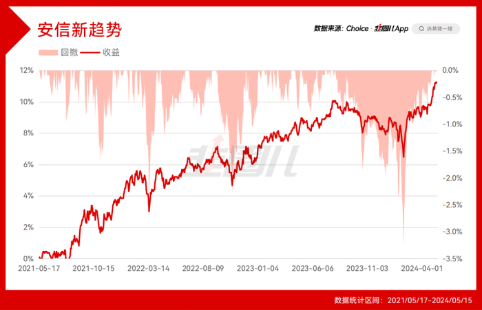 长安鑫益,每次筛产品都能找到的基金,过去3年2-3%的权益中枢,0.5%的最大回撤,12.9%的收益率,不知道是不是权益买得很轻的原因,收益风险比已经非常接近纯债了。