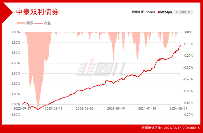 所以很多2022-2023新成立的固收+,多少都是按低波固收+的思路在做的,比如2022年债灾前夕,中泰资管发了个中泰双利,权益中枢应该在5%左右,近一年多的时间业绩表现确实比较有低波固收+的意思。