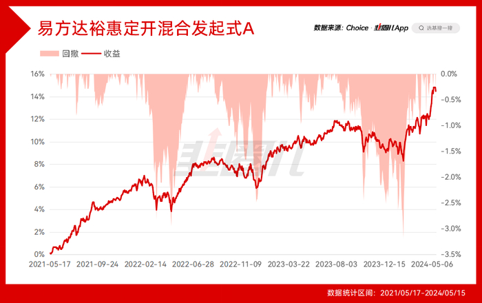 易方达裕惠回报有30%的权益中枢,近三年最大回撤3.2%,收益14.74%。