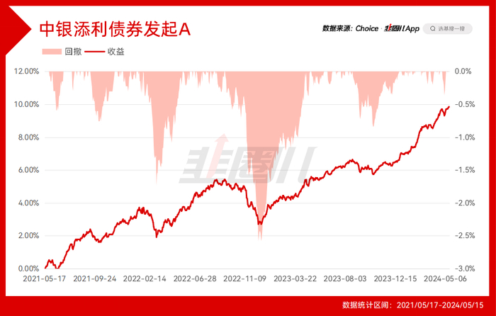 中银添利债券发起A,近三年最大回撤2.58%,近3年收益9.84%,2021-2023平均权益仓位是6.43%,2024Q1的权益占比7.7%。