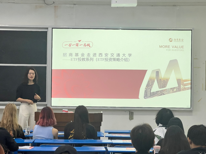 5月16日,招商基金走进西安交通大学,举办讲座交流,现场有近百名学生参与活动。活动现场,招商基金指数基金经理苏燕青为在校学生深入浅出地介绍了ETF投资原理、投资者如何运用ETF策略进行分散风险及长期投资、ETF与主动权益投资的区别等内容,学生们通过精彩的知识分享,增强了风险意识,更好的了解了ETF投资方法。