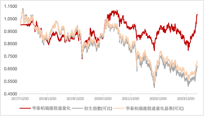 图:华泰柏瑞港股通量化累计单位净值与恒生指数走势