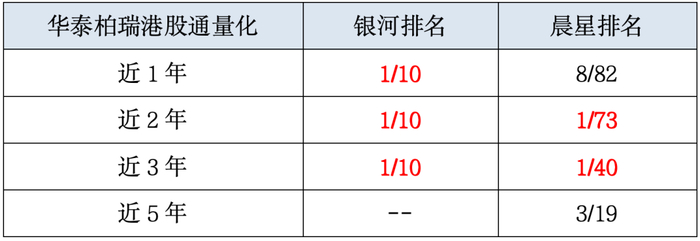 截至4月底,华泰柏瑞港股通量化近2/3年回报在晨星开放式基金-港股积极配置分类中同样排名居首,分别是1/73、1/40。同时荣获晨星三年期/五年期★★★★★评级。