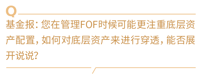 张文君:我不是特别清楚其他FOF基金经理的做法,但是大家可能都在不断地进化。我自己更多是从底层资产的维度去选择,首先,对底层资产有自己的观点,在此基础之上,形成对投资结构的想法,再去寻找与结构相匹配的标的配置。