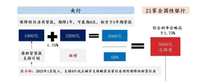 设立3000亿元保障性住房再贷款,激励21家全国性银行按照市场化原则,向地方国有企业发放贷款,支持以合理价格收购已建成未出售商品房,用作配售型或配租型保障性住房。利率1.75%,期限一年,可以展期四次(展期4年共5年,5年后不续),60%发放再贷款,预计将带动银行贷款总共5000亿元。必须国企来收储,不能是地方融资平台,收储必须是已建成待售的现房,用途必须进入保障房平台(卖、租)。遵循自愿原则,地方去申请资金,地方如果意愿不足不一定能全发出去。
