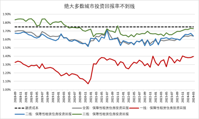计算下来,除了少数二线城市和三线城市之外,包括所有一线城市在内的所有城市保障房租金均无法cover融资成本,并且最后实际融资成本会高于1.75%(因为考虑到含有商业银行发放的部分贷款)。因此,目前算不出来经济账。换个角度如果使收购能够高于融资成本,一线城市需要8折收购,二线城市需要9折收购。(未考虑保障房租金更低、维护成本等其他支出,以及一次性改造费用成本和后续的出租率爬坡期)