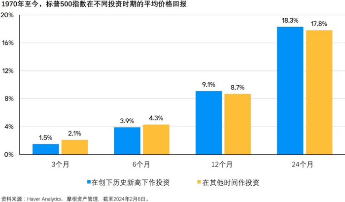 首先,历史数据显示,与其他时候相比,在历史高位投资美国股票,并无明显优势或劣势。自1970年至今的50多年间,标普500指数在创下历史新高后12个月的平均价格回报为9.1%,而在其他日子的平均价格回报则为8.7%2从过往业绩所见,在历史高位投资对长期回报并无产生重大影响。
