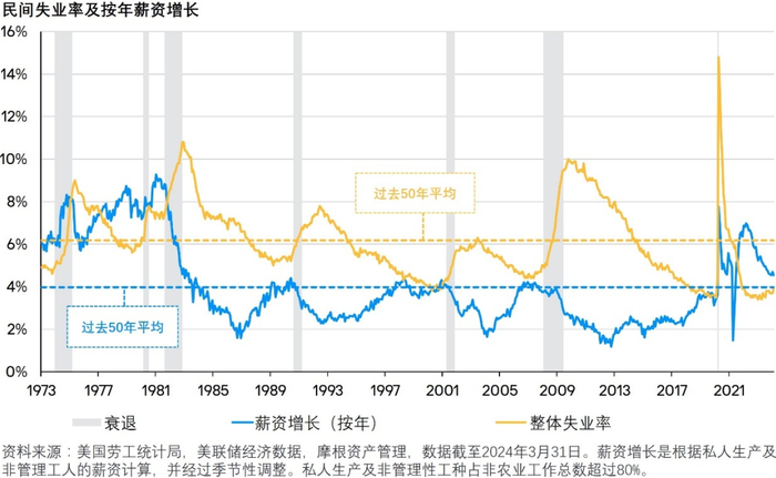 其次,美国经济前景仍然正面。即使外界担心在趋紧的利率及短暂性的地区银行危机下会出现硬着陆,但是美国经济在2023年第四季仍然增长逾3%3更为关键的是,失业率创下纪录低位,而实际薪资在通胀降温下上升,均支持美国的消费市场保持强韧。股票及住房等资产价格上升带来财富效应,可能会持续支持实际消费者支出,因为较富裕的消费者倾向会减少储蓄并增加开支。由于消费约占美国国内生产总值(GDP)4 的70%,即使增长速度较去年缓慢,但强韧的消费者为经济持续扩张奠下坚实基础。在失业率偏低、劳动力市场紧绌,以及薪资上升的支持下,美国消费者保持强韧。