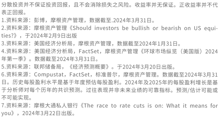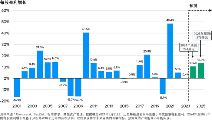更重要的是,经过2023年投资者对人工智能的乐观情绪,令市场仅有限地受大型科技股主导过后,盈利增长有望扩展至指数的其他成分股。一个更广泛、更完整,并涵盖大型科技股以外多数公司的升势,或会带动美国股市出现更健康、更具可持续性的涨幅。数据显示,这种情况可能正在开始,在年初至今(截至2024年3月22日),标普500指数的成分股当中有37%跑赢大市,并有73%录得升幅7盈利前景持续正面,市场预期标普500指数2024年及2025年或将取得双位数的增长。